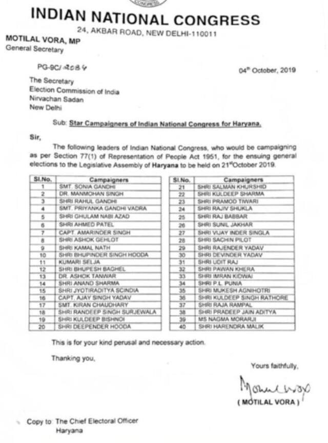 ਰੋਹਤਕ: ਜ਼ਿਮਨੀ ਚੋਣਾਂ ਲਈ ਕਾਂਗਰਸ ਨੇ ਹਰਿਆਣਾ ਚੋਣਾਂ ਲਈ ਆਪਣੇ 40 ਪ੍ਰਚਾਰਕਾਂ ਦੀ ਲਿਸਟ ਜਾਰੀ ਕੀਤੀ ਹੈ। ਖ਼ਾਸ ਗੱਲ ਇਹ ਹੈ ਕਿ ਇਸ ਵਾਰ ਕਾਂਗਰਸ ਦੇ ਸਟਾਰ ਪ੍ਰਚਾਰਕ ਰਹੇ ਨਵਜੋਤ ਸਿੰਘ ਸਿੱਧੂ ਦਾ ਨਾਂ ਸ਼ਾਮਲ ਨਹੀਂ ਕੀਤਾ ਗਿਆ। ਹਾਲਾਂਕਿ ਪਾਰਟੀ ਤੋਂ ਨਾਰਾਜ਼ ਚੱਲ ਰਹੇ ਅਸ਼ੋਕ ਤੰਵਰ ਨੂੰ ਸਟਾਰ ਪ੍ਰਚਾਰਕ ਰੱਖਿਆ ਗਿਆ ਹੈ।