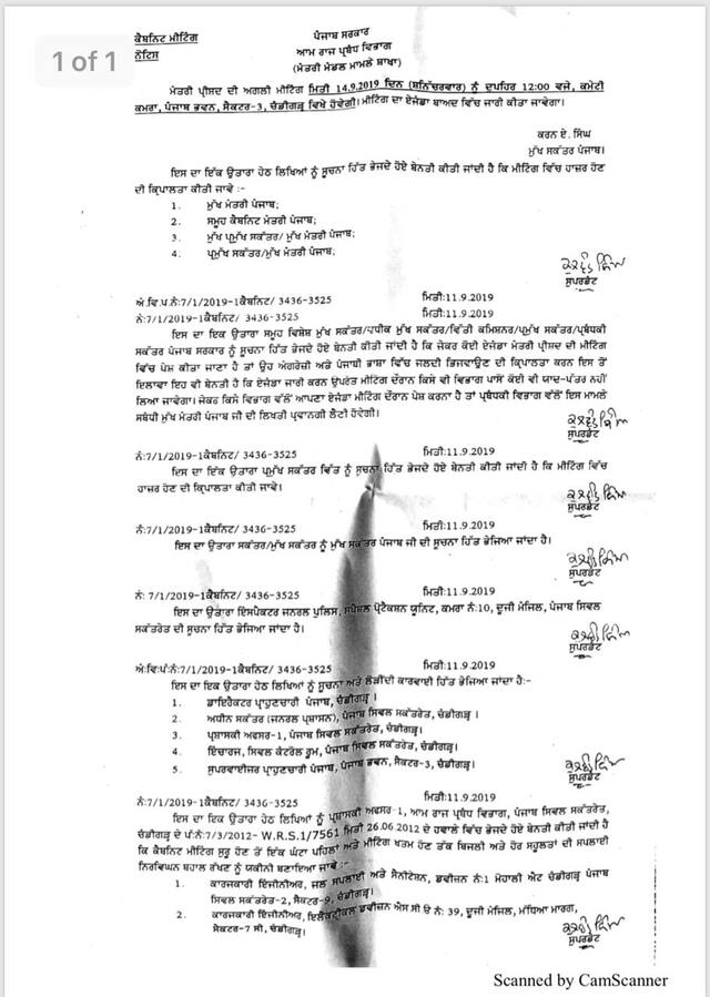 ਸਰਕਾਰੀ ਸਰਕੂਲਰ ਮੁਤਾਬਕ ਮੁੱਖ ਮੰਤਰੀ ਕੈਪਟਨ ਅਮਰਿੰਦਰ ਸਿੰਘ ਦੀ ਅਗਵਾਈ ਹੇਠ 14 ਸਤੰਬਰ ਨੂੰ ਪੰਜਾਬ ਭਵਨ ਸੈਕਟਰ-3 ਚੰਡੀਗੜ੍ਹ ਵਿੱਚ 12 ਕੈਬਨਿਟ ਦੀ ਮੀਟਿੰਗ ਹੋਏਗੀ।