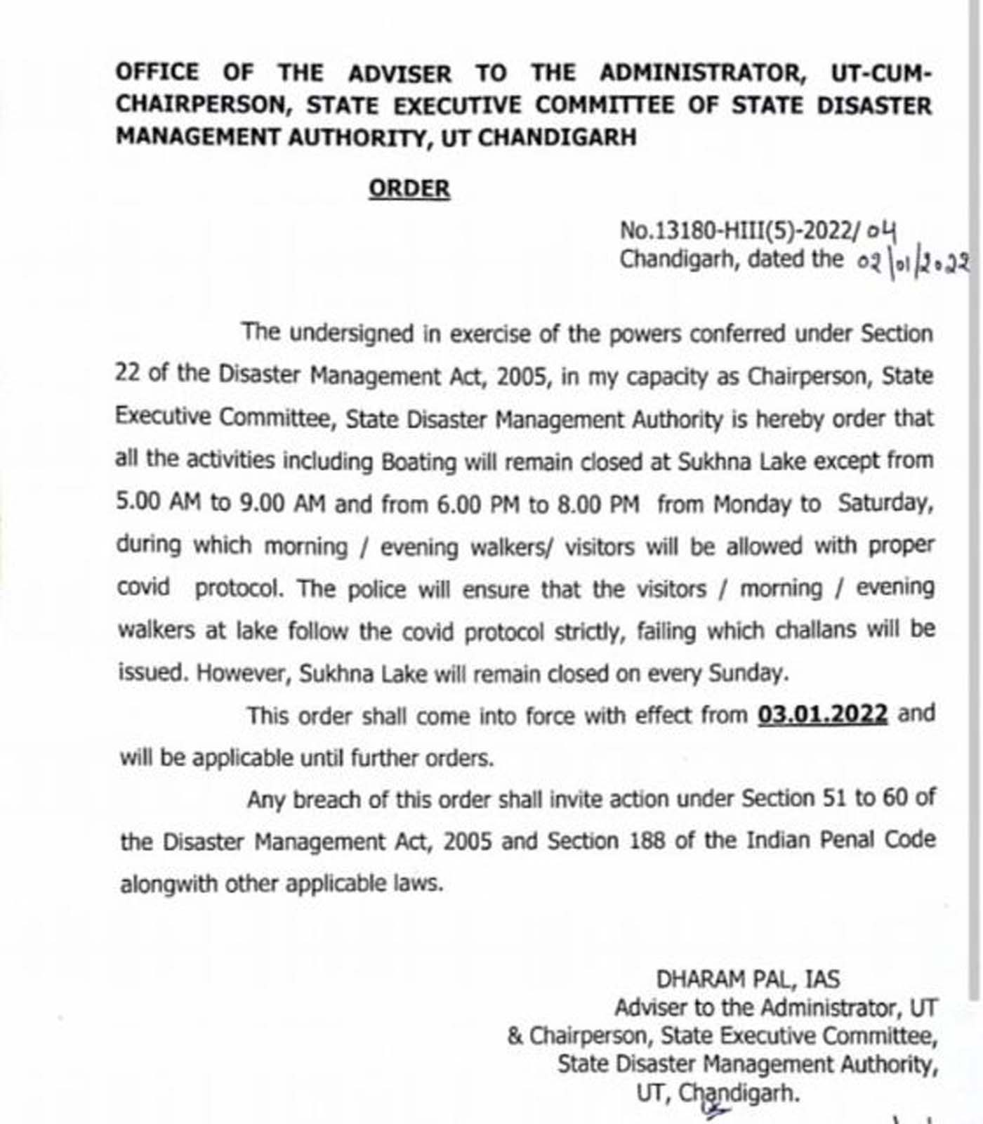 *ਚੰਡੀਗੜ੍ਹ ਪ੍ਰਸ਼ਾਸਨ ਦਾ ਕੋਰੋਨਾ ਦੇ ਮੱਦੇਨਜ਼ਰ ਵੱਡਾ ਫੈਸਲਾ, ਐਤਵਾਰ ਨੂੰ ਬੰਦ ਰਹੇਗੀ ਸੁਖਨਾ ਝੀਲ*
