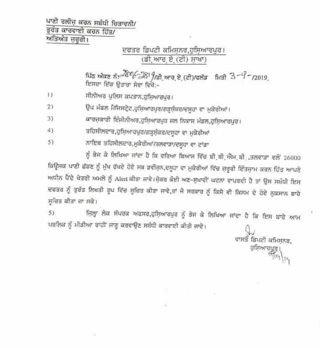ਉਨ੍ਹਾਂ ਕਿਹਾ ਕਿ ਹੜ੍ਹਾਂ ਦੌਰਾਨ ਸਬ-ਡਵੀਜ਼ਨ ਦਸੂਹਾ ਤੇ ਮੁਕੇਰੀਆਂ ਵਿਚਲੇ ਪਿੰਡ ਪ੍ਰਭਾਵਿਤ ਹੁੰਦੇ ਹਨ, ਇਸ ਲਈ ਇਨ੍ਹਾਂ ਸਬ-ਡਵੀਜ਼ਨਾਂ ਅਧੀਨ ਪੈਂਦੇ ਨਾਜ਼ੁਕ ਪਿੰਡਾਂ ਵਿਚ ਚੌਕਸੀ ਹੋਰ ਵਧਾ ਦਿੱਤੀ ਗਈ ਹੈ। ਪ੍ਰਸਾਸ਼ਨ ਵਲੋਂ ਸਿਹਤ ਸਹੂਲਤਾਂ ਤੋਂ ਇਲਾਵਾ ਰਾਸ਼ਨ, ਤਰਪਾਲਾਂ, ਲਾਈਫ ਜੈਕਟਾਂ, ਟੈਂਟ ਆਦਿ ਦੇ ਪ੍ਰਬੰਧਾਂ ਤੋਂ ਇਲਾਵਾ ਫਲੱਡ ਕੰਟਰੋਲ ਰੂਮ ਵੀ ਸਥਾਪਿਤ ਕਰ ਦਿੱਤੇ ਗਏ ਹਨ।