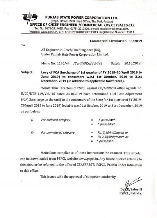 ਪਾਵਰਕਾਮ ਮੁਤਾਬਕ ਚਾਲੂ ਵਿੱਤੀ ਵਰੇ ਦੀ ਪਹਿਲੀ ਤਿਮਾਹੀ ਪਹਿਲੀ ਅਪ੍ਰੈਲ ਤੋਂ 30 ਜੂਨ 2019 ਤਕ ਦੇ ਸਮੇਂ ਲਈ ਮੀਟਰਡ ਵਰਗ ਲਈ 5 ਪੈਸੇ ਪ੍ਰਤੀ ਯੂਨਿਟ ਦੀ ਦਰ ਨਾਲ ਪਿਛਲੇ ਬਕਾਏ ਪਹਿਲੀ ਅਕਤੂਬਰ ਤੋਂ 31 ਦਸੰਬਰ 2019 ਤਕ ਦੇ ਸਮੇਂ ਵਿਚ ਬਿਜਲੀ ਬਿੱਲਾਂ ਦੇ ਨਾਲ ਉਗਰਾਹੇ ਜਾਣਗੇ। ਗ਼ੈਰ ਮੀਟਰਡ ਵਰਗ ਲਈ ਇਹ ਦਰ 3.18 ਰੁਪਏ ਪ੍ਰਤੀ ਕਿਲੋਵਾਟ ਜਾਂ 2.38 ਰੁਪਏ ਪ੍ਰਤੀ ਹਾਰਸ ਪਾਵਰ ਜਾਂ ਫਿਰ 5 ਪੈਸੇ ਪ੍ਰਤੀ ਯੂਨਿਟ ਹੋਵੇਗੀ।