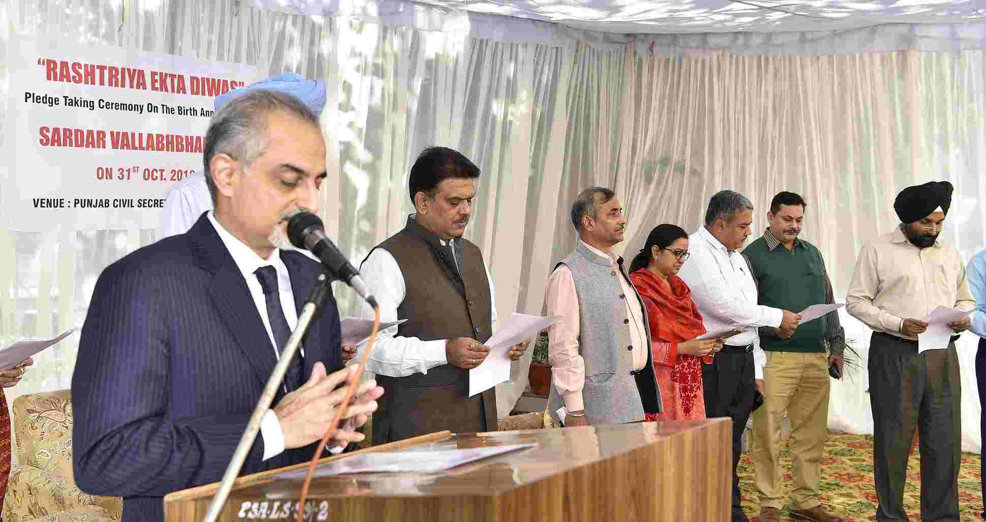 ਚੰਡੀਗੜ੍ਹ•,(ਸਾਰਾ ਯਹਾ) 31 ਅਕਤੂਬਰ: ਸਰਦਾਰ ਵੱਲਭ ਭਾਈ ਪਟੇਲ ਦੇ ਜਨਮ ਦਿਵਸ ਮੌਕੇ ਅੱਜ ਪੰਜਾਬ ਸਰਕਾਰ ਵੱਲੋਂ ਸੂਬੇ ਭਰ ਵਿੱਚ ‘ਰਾਸ਼ਟਰੀ ਏਕਤਾ ਦਿਵਸ’ ਮਨਾਇਆ ਗਿਆ। ਪੰਜਾਬ ਦੇ ਮੁੱਖ ਸਕੱਤਰ ਸ੍ਰੀ ਕਰਨ ਅਵਤਾਰ ਸਿੰਘ ਨੇ ਪੰਜਾਬ ਸਿਵਲ ਸਕੱਤਰੇਤ-1 ਦੇ ਅਧਿਕਾਰੀਆਂ ਅਤੇ ਕਰਮਚਾਰੀਆਂ ਨੂੰ ‘ਰਾਸ਼ਟਰੀ ਏਕਤਾ ਦਿਵਸ’ ਮੌਕੇ ਸਹੁੰ ਚੁਕਾਈ।