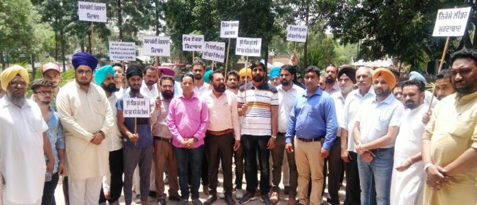 ਫੋਟੋ ਕੈਪਸ਼ਨ: ਸਮਰਾਲਾ ਸ਼ਹਿਰ ਦੀਆਂ ਸੰਸਥਾਵਾਂ ਦੇ ਆਗੂ ਐੱਸ.ਡੀ.ਐੱਮ. ਦਫ਼ਤਰ ਵਿਖੇ ਸੜ•ਕਾਂ ਦੀ ਰਿਪੇਅਰ ਦੀ ਮੰਗ ਨੂੰ ਲੈ ਕੇ ਰੋਸ ਵਿਖਾਵਾ ਕਰਦੇ ਹੋਏ।